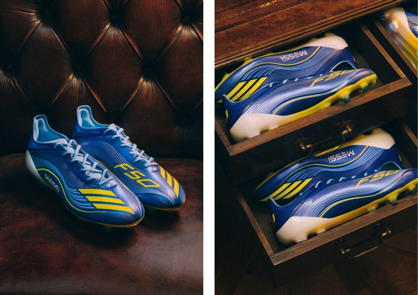 Thiết kế dựa trên tầm nhìn xa trông rộng của Messi trong bóng đá, mang đến một diện mạo sắc sảo, kết hợp giữa quá khứ và hiện tại. Phần đế giày màu Blue Burst được tô điểm bằng những đường gợn sóng màu Xanh Nhạt, điểm xuyết bởi ba sọc Solar Yellow nổi bật ở mũi giày. Lật ngược lại, bạn sẽ thấy đế giày màu vàng chuyển dần sang màu trắng qua hiệu ứng phai màu gradient — một sự gợi nhớ đến tốc độ và sự nhẹ nhàng. Phối màu này mang âm hưởng tinh tế của phiên bản đặc trưng F50i Messi từ năm 2009, kết nối những kỷ nguyên của một sự nghiệp vẫn luôn thách thức thời gian.