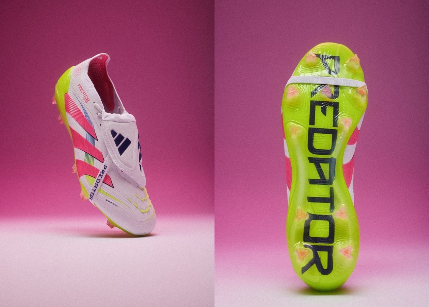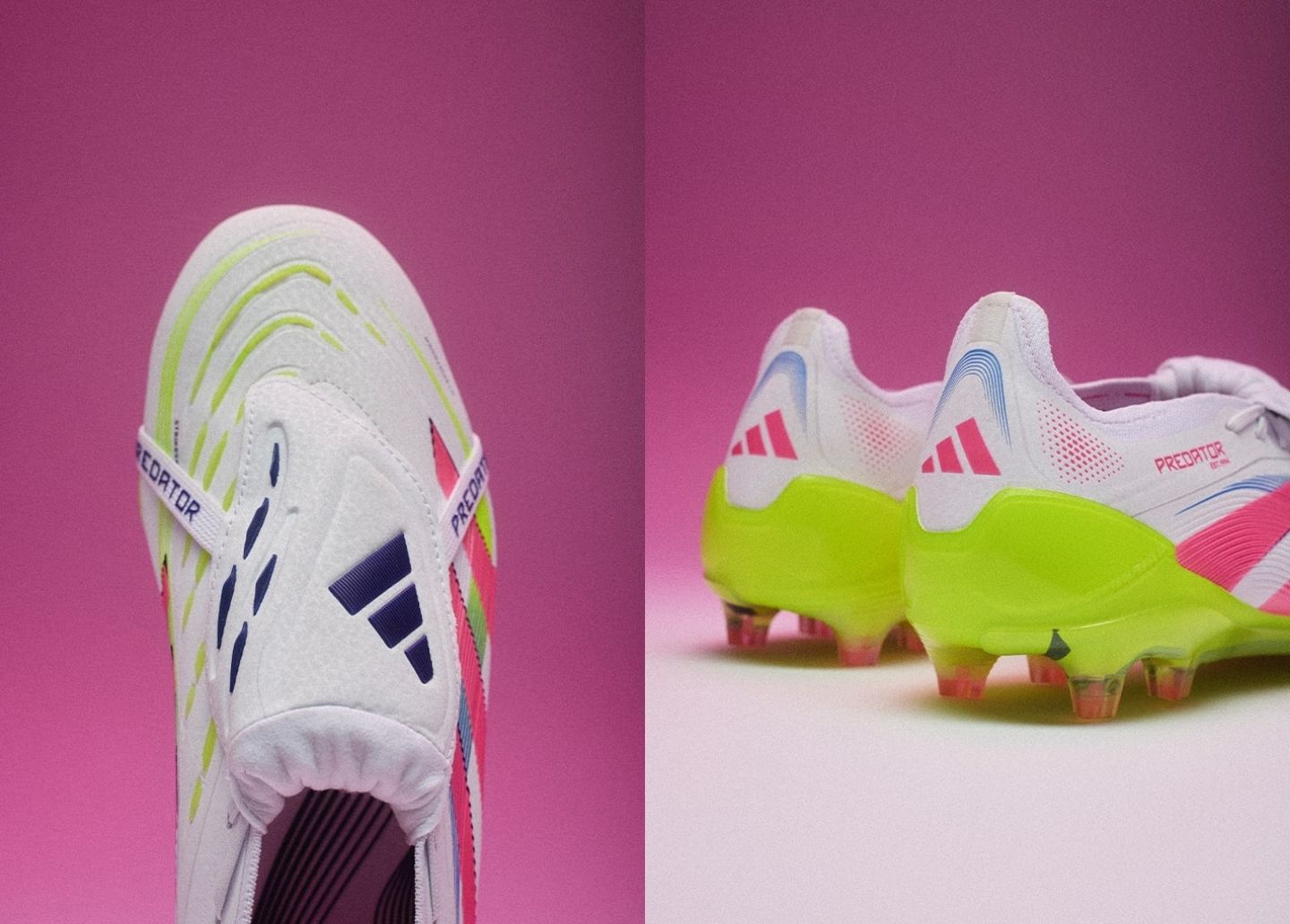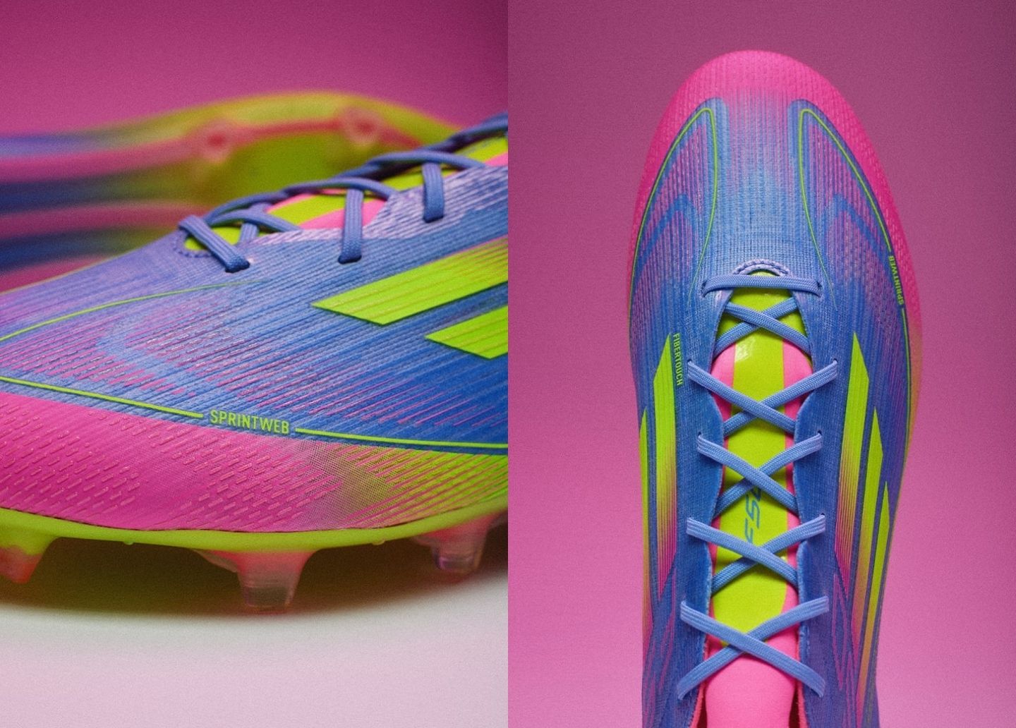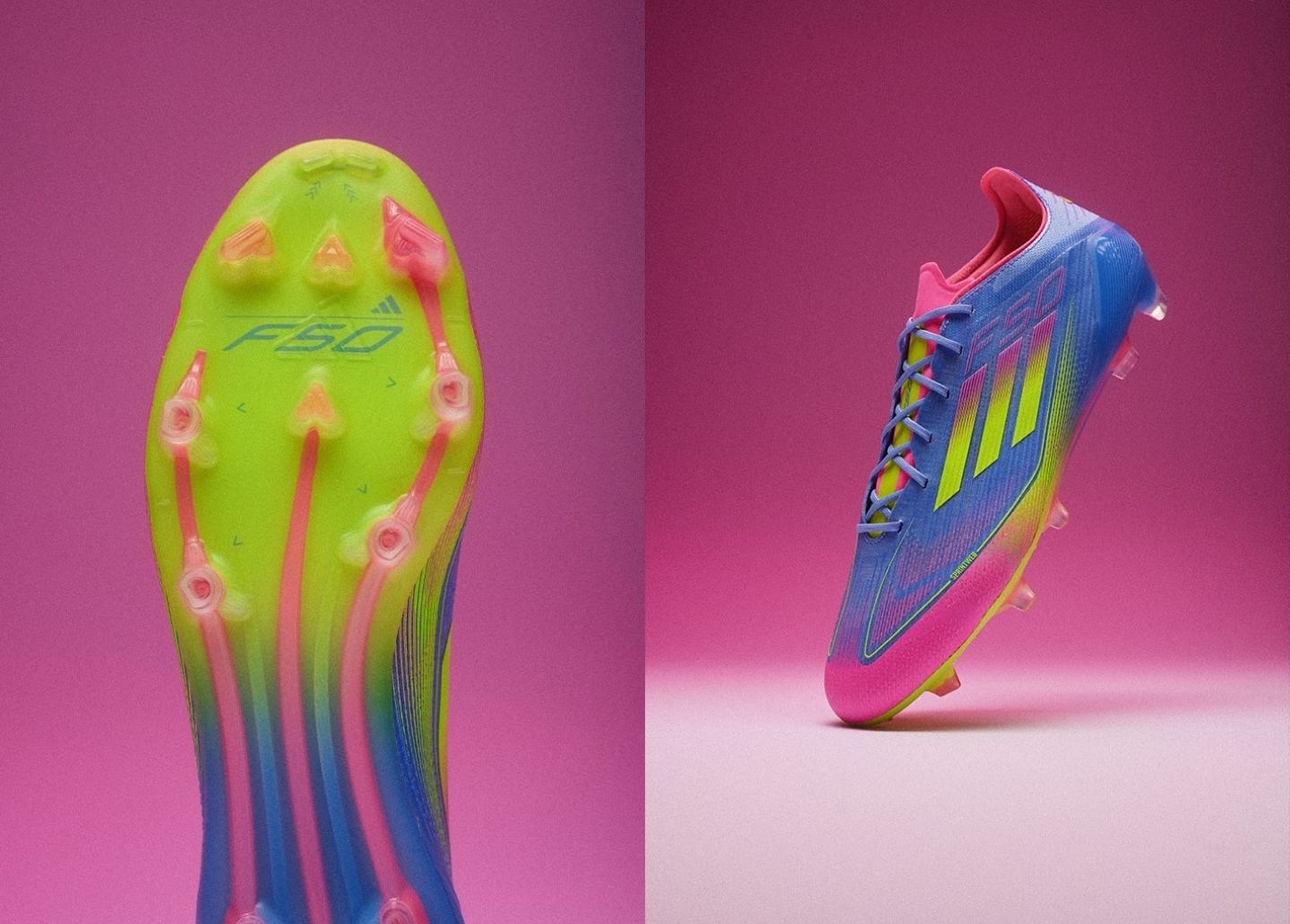 Có lẽ là mẫu giày phá cách nhất trong bộ sưu tập, F50 có màu sắc điện “Blue Fusion/Lucid Lemon/Lucid Pink”. Phần trên ‘Fibretouch’ có thiết kế chuyển màu, chuyển màu xanh lam mịn thành màu hồng gần mũi giày. Màu hồng rực rỡ cũng chiếm hết lưỡi gà và thương hiệu F50 ở mặt bên và mặt giữa. Ba sọc biểu tượng bám sát họa tiết chuyển màu, pha trộn ‘Lucid Pink’ thành ‘Lucid Yellow’. Màu vàng điện chạy dọc theo đế giày trước khi hòa vào một màu chuyển khác.