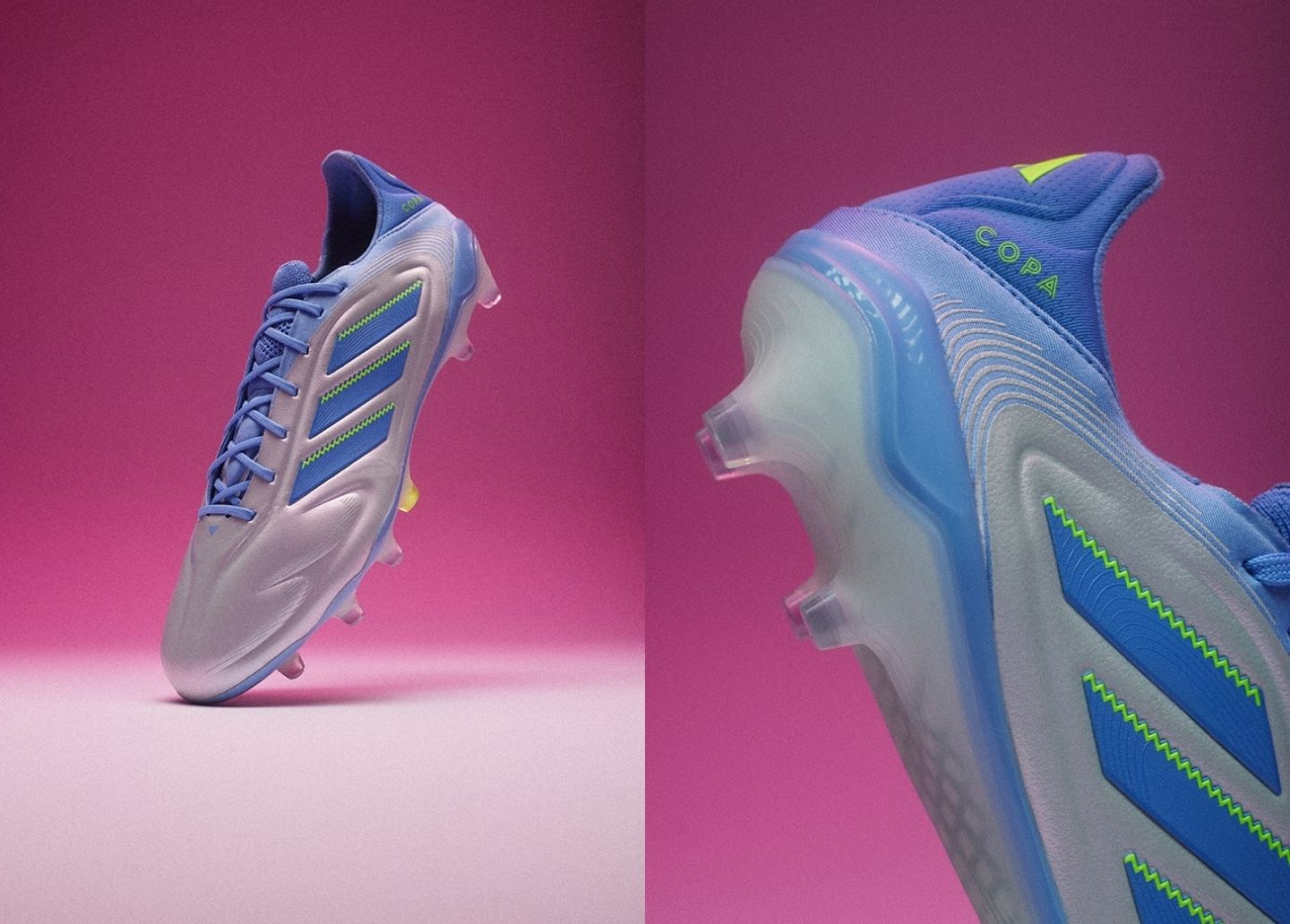 Cuối cùng, mẫu giày Copa mới nhất là một đôi giày cổ điển được sơn theo thiết kế tương lai. Được thiết kế theo phối màu “Halo Blue/Blue Fusion/Lucid Lemon”, phần trên mềm mại có tông màu bạc xanh lam, bao quanh mũi giày và hai bên hông giày. Các chi tiết khác trên giày cũng mang chủ đề màu xanh lam – màu xanh lam đậm hơn bao phủ ba sọc và lưỡi gà, cũng như viền đế giày.