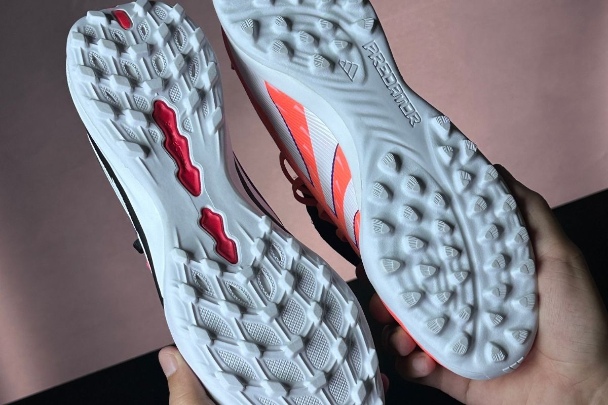 Predator 26 League TF: Adidas đã mang đến một cuộc cách mạng nhỏ ở phần đế. Các đinh dăm được thiết kế lại theo dạng hình lưỡi liềm (Crescent-shaped) đan xen với các đinh tam giác. Cấu trúc mới này không chỉ giúp bám sân cực gắt khi bứt tốc thẳng mà còn tối ưu hóa các pha chuyển hướng đột ngột (Agility), giúp mắt cá chân không bị vặn xoắn quá mức.